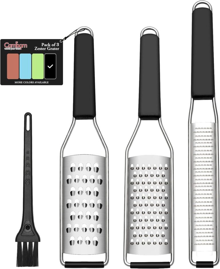 Home » Cambom Lemon Zester Grater Three-piece Suit – Heavy Duty Kitchen Tool for Parmesan Cheese, Ginger, Garlic, Nutmeg, Chocolate, Vegetables,Fruits,Stainless Steel Grater Dishwasher Safe Black
