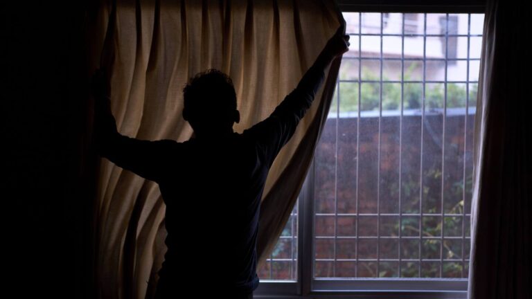 A Tibetan living in exile pulls the curtain before he gives an interview in Kathmandu, Nepal, April 14, 2025. (AP Photo/Niranjan Shrestha)