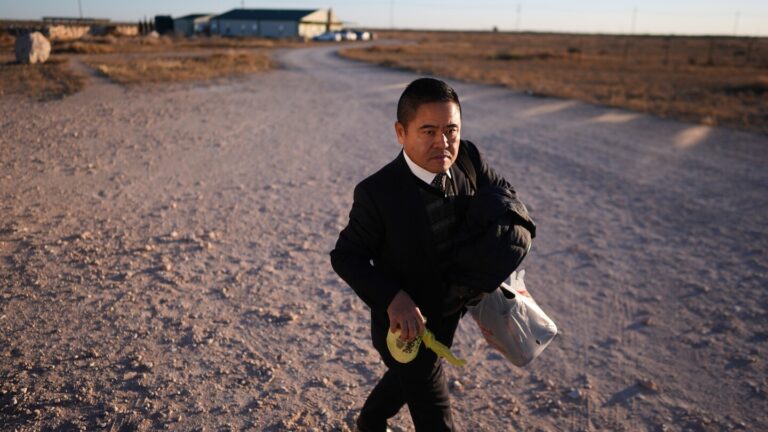 Former Chinese official Li Chuanliang walks between buildings in the Mayflower Church community, in Midland, Tex., Jan. 19, 2025. (AP Photo/Rebecca Blackwell)