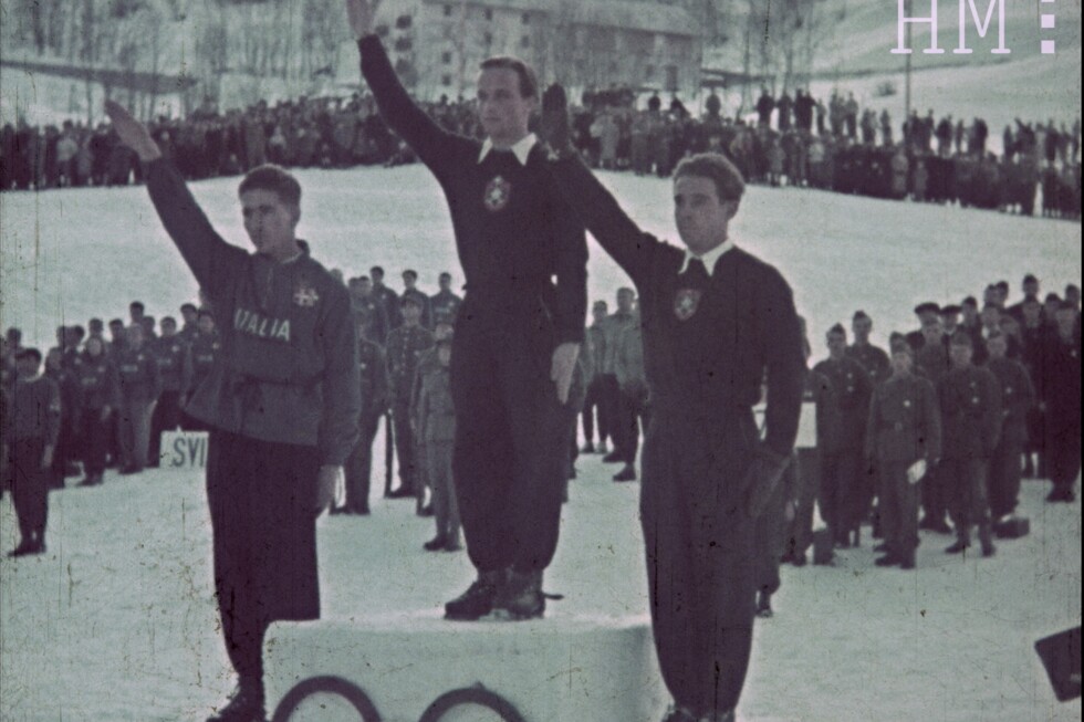 Old newsreels from the 1941 championships and an amateur film show athletes giving fascist salutes on medal stands, Nazi flags displayed throughout Cortina and a heavy military presence.