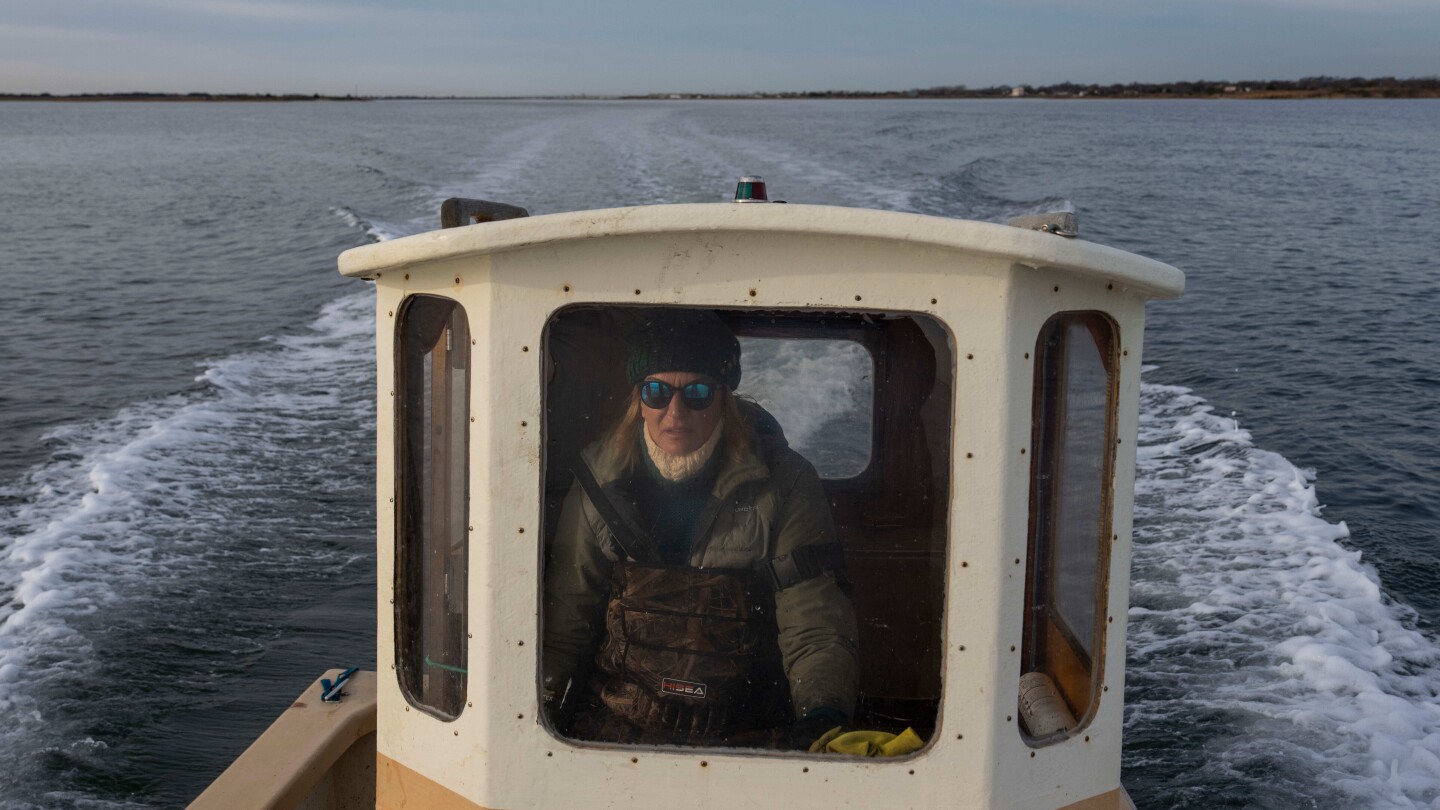 After seven days of wind, the morning is finally calm enough on New York’s East Moriches Bay for Sue Wicks to jetty her boat to check on her oysters. Hundreds of cages pop out at odd angles from their lines, and a few float away.