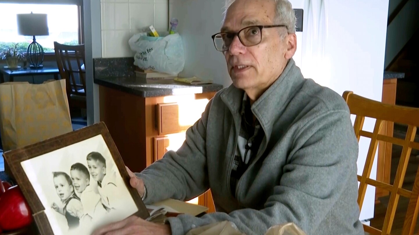 John Prevost, brother of new Pope Leo XIV, holds a portrait of the three Prevost brothers from 1958, Pope Leo, 3, left, John, 4, and Louis, 7, at his home, May 8, 2025, in New Lenox, Ill. (AP Photo/Obed Lamy, File)