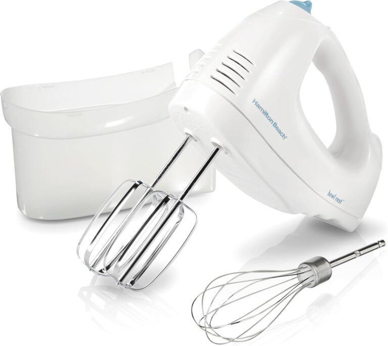 Whip up an airy meringue or decadent cake with the Hamilton Beach hand mixer. This versatile mixer is your go-to appliance for mixing, whisking, and folding with 250W of peak power. A built-in bowl rest makes it easier to set the mixer down when adding ingredients. The mixer has six speeds, including quick burst functions for additional power at any speed. The Hamilton Beach hand mixer is not just about performance, it’s also designed for easy storage. A convenient snap-on case keeps attachments together, so you don’t have to search for them each time you need them. Includes traditional beaters and whisk.Snap-On Storage Case No more digging through the drawers to find your mixer attachments. A storage case perfectly fits all the attachments and cord. It then snaps onto the mixer, keeping everything together in one place.Snap-On Storage Case: No more digging through the drawers to find your mixer attachments. A storage case perfectly fits all the attachments and cord. It then snaps onto the mixer, keeping everything together in one place.
