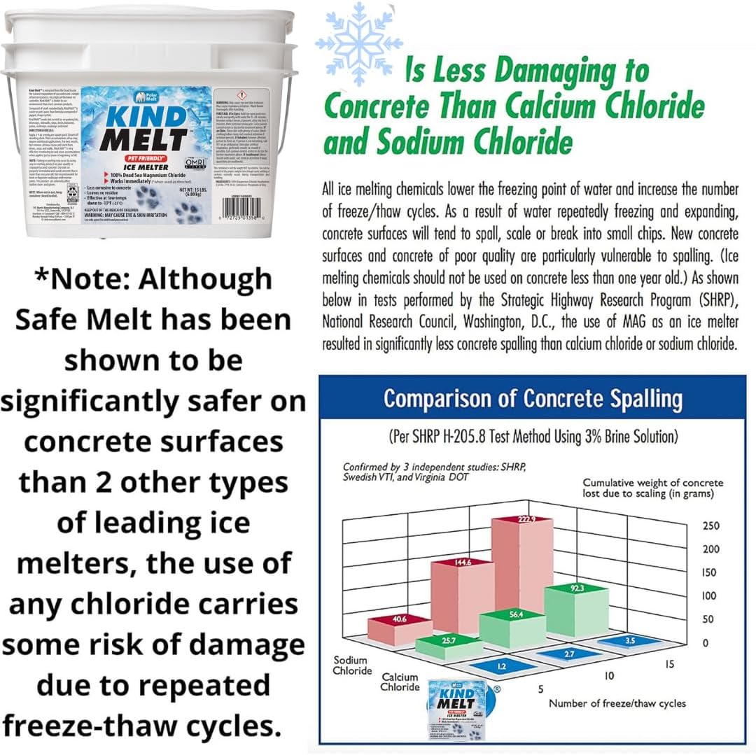 Kinder to the environment than traditional rock salt ice melters and less corrosive to concrete