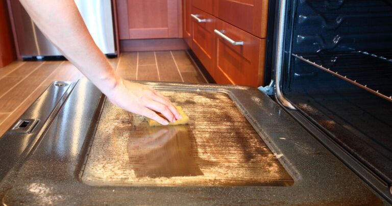 Spray the solution on the areas you want to clean and let it sit for five minutes. Then wipe it off with a recycled paper towel or a microfibre towel so you don’t scratch your oven.