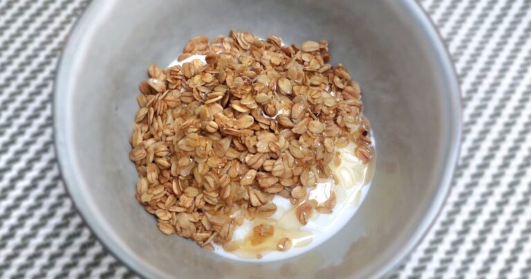 I have been enjoying my homemade granola with yoghurt, a drizzle of honey, and some peanut butter, but you could have it plain with milk or with cottage cheese for extra protein.