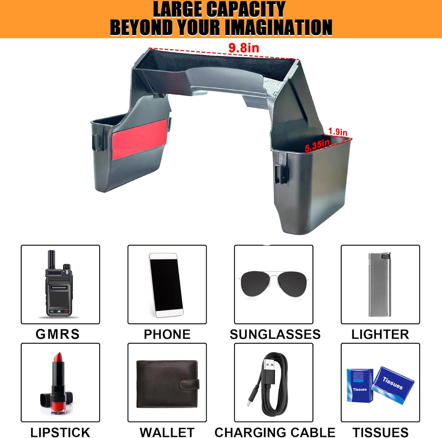 【MORE STORGE】The bottom and inner surface of the side storage box are covered with cushioning pads to prevent items from scratching, the smooth edges of the box provide a more comfortable contact. A larger phone can stand up without falling down, perfect for a cell phone connected to CarPlay. Can hold GMRS, hand sanitizer, lipstick, wallet, tissues etc (Product without US flag).