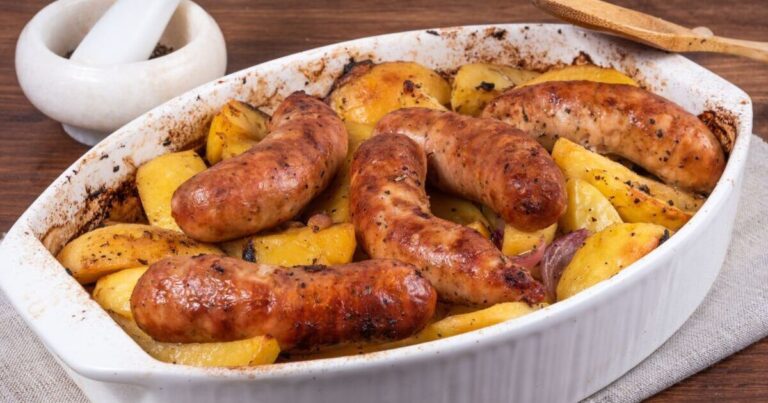 Roast for about 30 to 35 minutes, or until golden brown. Remove the sausages from the oven, then turn them over and toss the vegetables in the cooking juices.