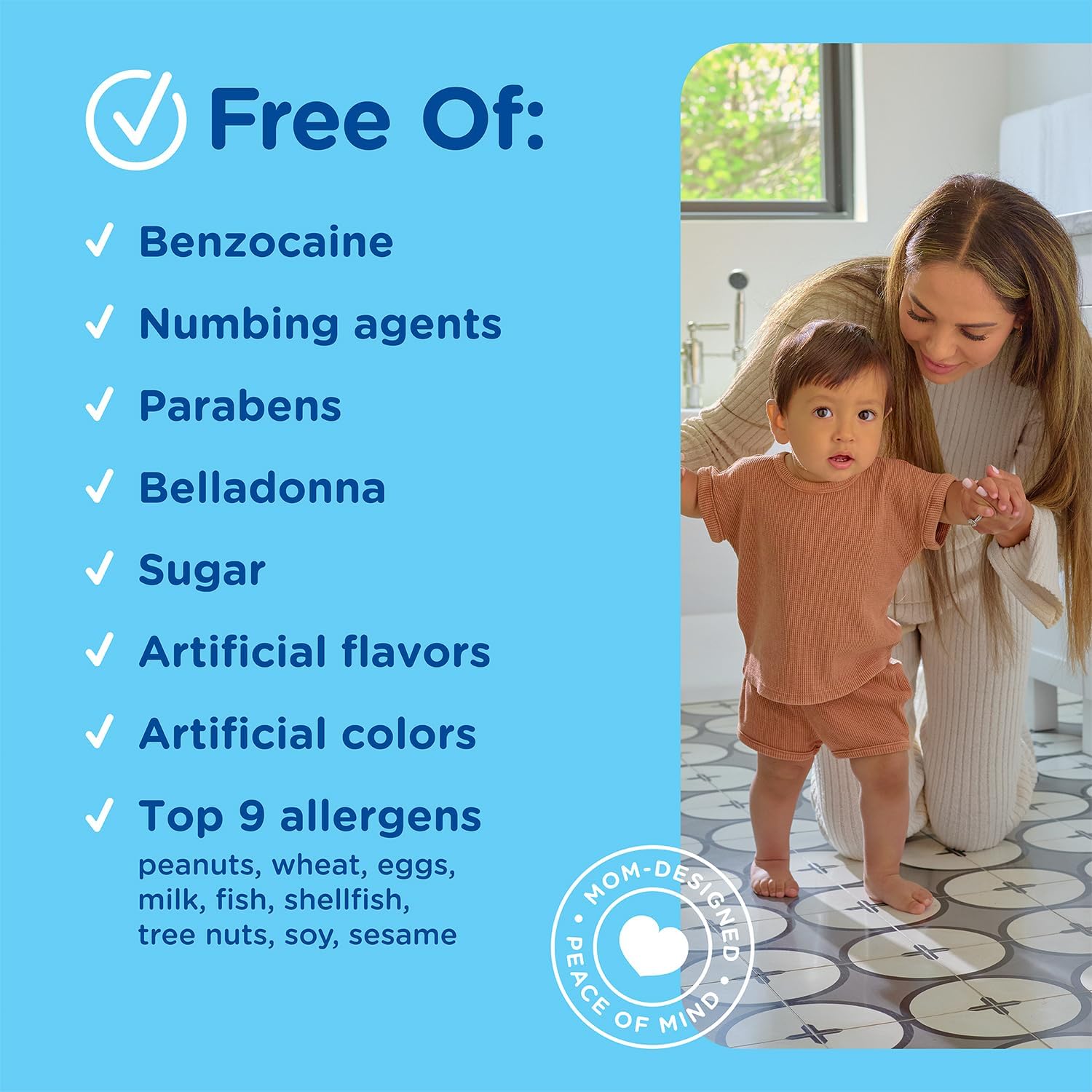 No benzocaine, No belladonna, No alcohol or parabens, No numbing or cooling, Non-GMO, Free of Top 8 Allergens, No artificial color and flavors: We believe simpler is better, so we include only what your child needs and never anything they don’t