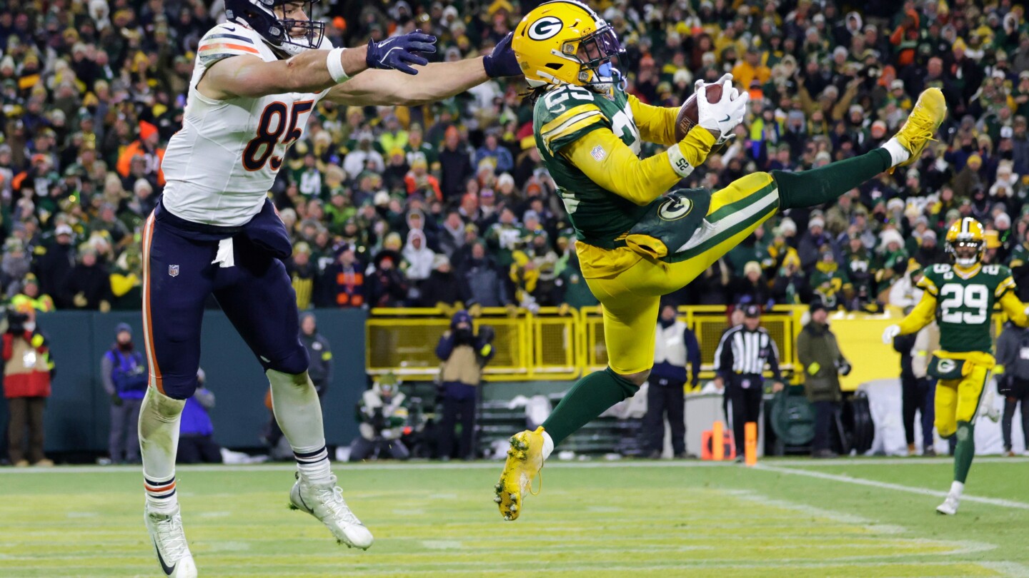 The Packers were facing third-and-2 from Chicago’s 28 when Love pitched right to Jacobs. Chicago’s Montez Sweat, Gervon Dexter, D’Marco Jackson and Jaylon Johnson were all converging on Jacobs behind the line of scrimmage.