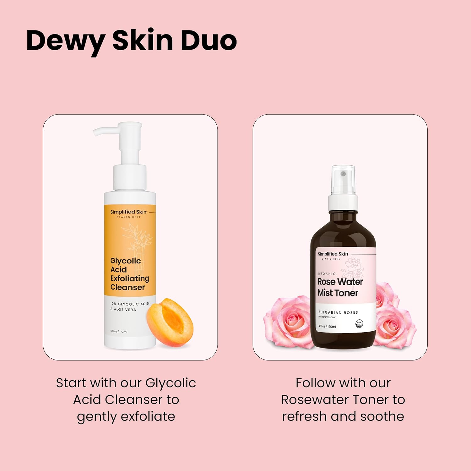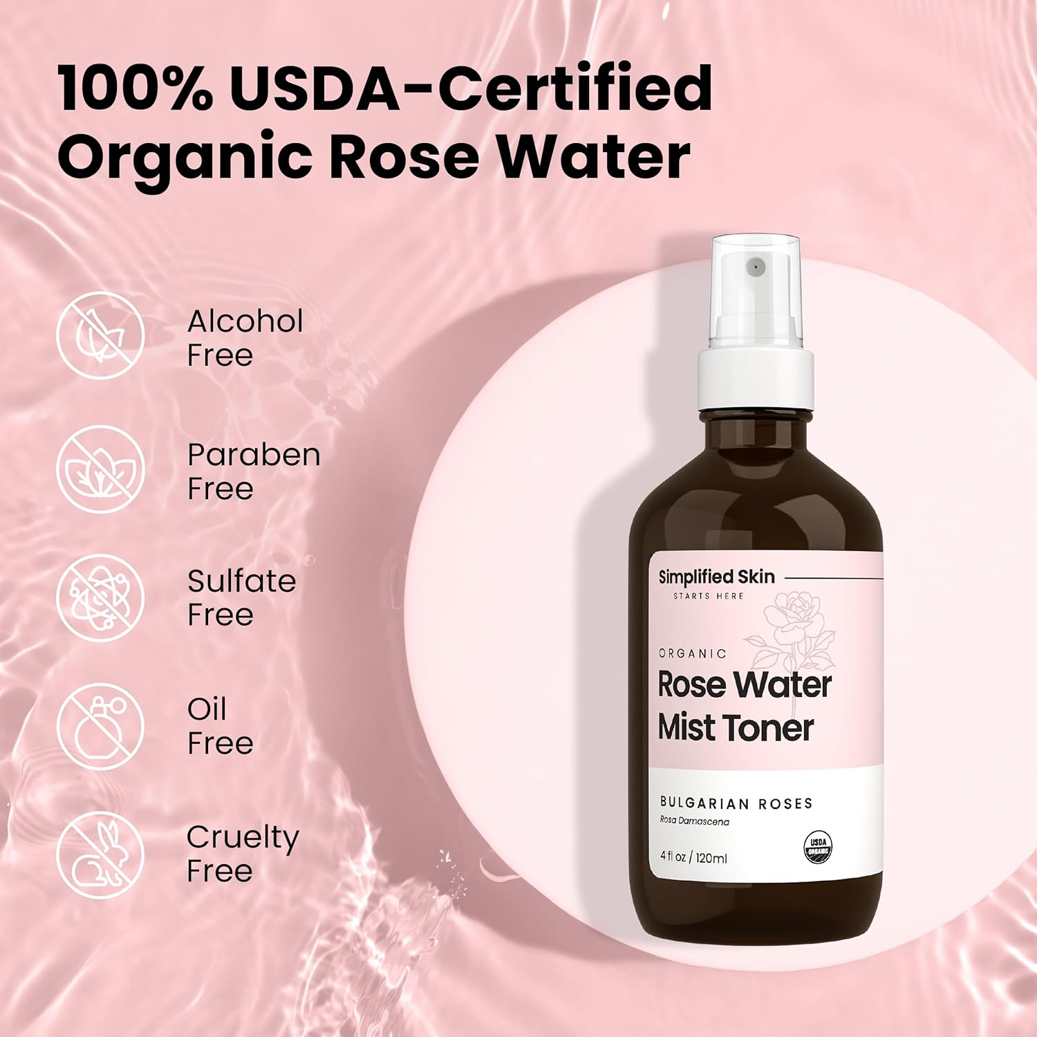 USDA-Certified Organic Rose Water Spray for Face & Hair: Simplified Skin rosewater spray delivers soothing hydration with every spritz. Made from Bulgarian rose water, it refreshes and revitalizes the skin, hair, and body.
