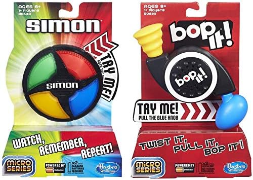 Go mobile with the Simon Micro Series game! and the Bop It! Micro Series game! Simon Micro Series: Play alone in Solo mode or play with friends in Pass It mode, but either way the Simon Action with this Micro Series game is going to be epic! Bop It! Micro Series: Play against yourself or play with friends, but either way the Bop It! Action with this Micro Series game is going to be epic!