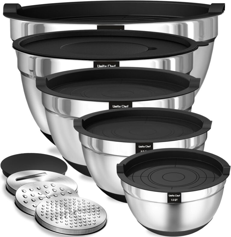 AIRTIGHT BPA FREE LIDS & 5 SIZES BOWLS: The range of sizes from 5QT down to 1.5QT, makes this set incredibly versatile and suitable for a wide range of tasks. Each bowl comes with a QT label to make it easier to choose the right size. The airtight lids that come with this mixing bowl set make it easy to store ingredients and leftovers to Keep your food fresh for longer without worrying about spills or leaks. Bowl sizes fit on standard-size refrigerator shelves and cabinets.