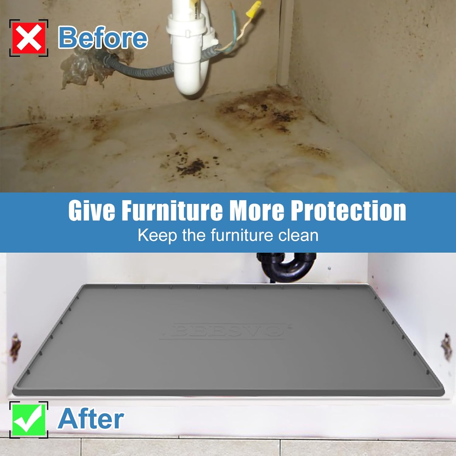 Introducing BEESVO Heavy Duty Under Sink Mat, specially crafted to shield your sink cabinet base from damage or staining caused by leaked soaps, water, and spills. The flexible silicone surface acts as a robust barrier between liquids and cabinets. We offer a variety of sizes of silicone mats for your base cabinet, featuring a chic grey finish that seamlessly blends in, masking stains effortlessly. With its durable, all-purpose design, it’s ideal for kitchens, bathrooms, or utility rooms where spills or leaks may occur. Bid farewell to worries and simplify your household chores.