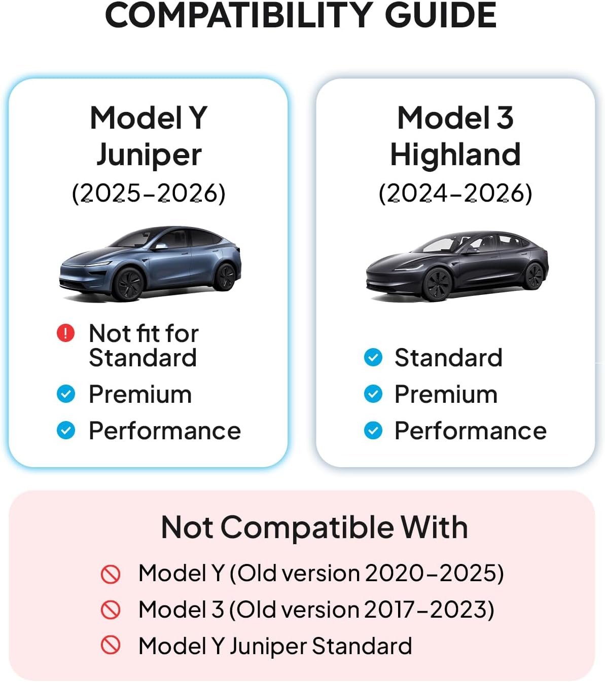 【Precise Fit for Refresh Tesla Model】Compatible with Model 3 (2024–2025) Highland and the refreshed Model Y (2025–2026) Juniper (referred to as 2026 Model Y due to VIN year coding). Not compatible with pre-refresh Model Y (2021-2025) & Model 3 (2021-2023). Tailored to match updated interiors precisely